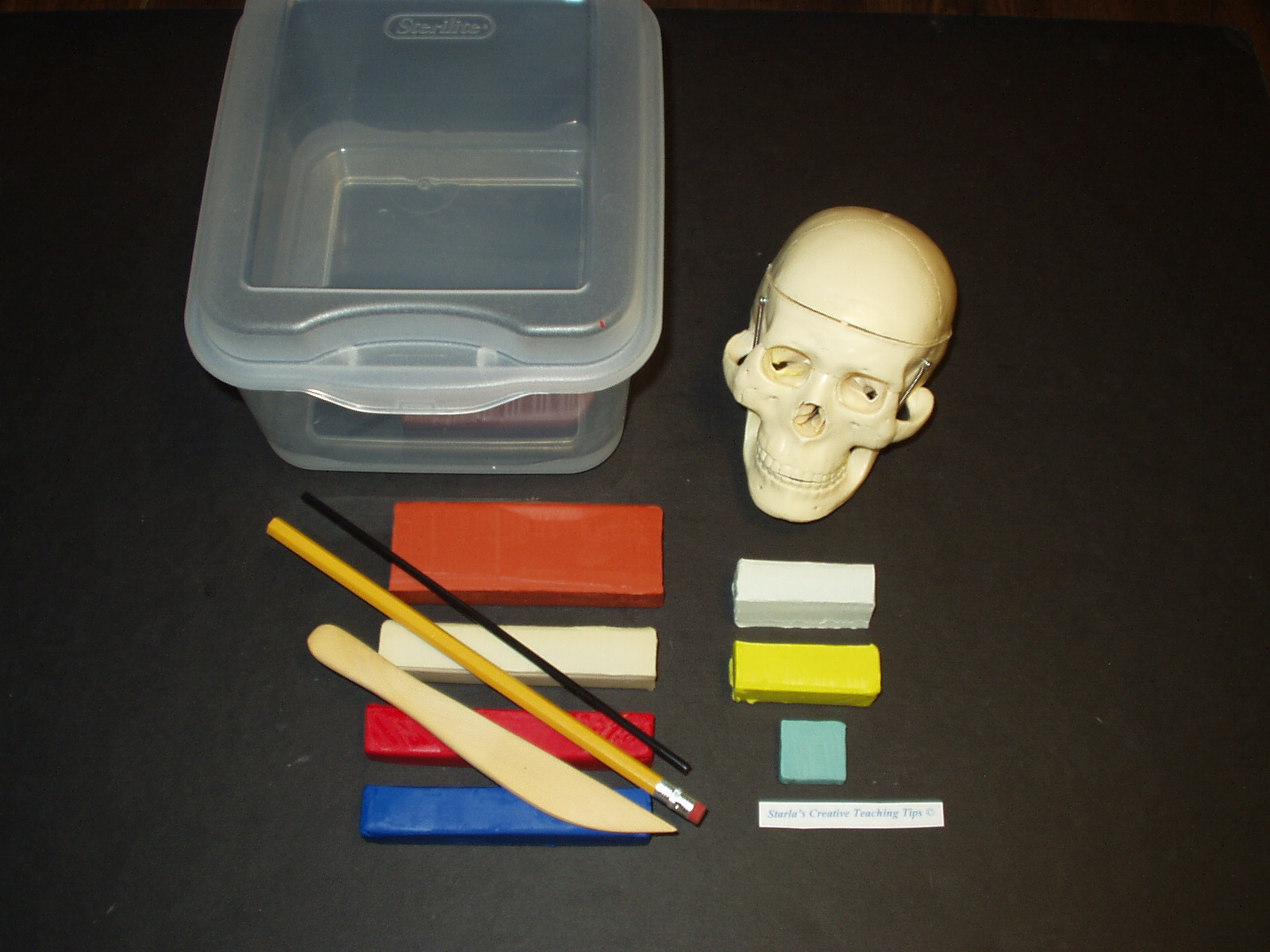 CLAY (Enough clay to build both sides and a tooth. Clay colors are Terra Cotta, Ivory, Yellow, White, Red, Blue, and an extra color for the eye color! This clay is a Plastilina clay that does not dry out and can be used over each year after 'Funeral Day', which is a review and break down to get the kits ready for the next class.)