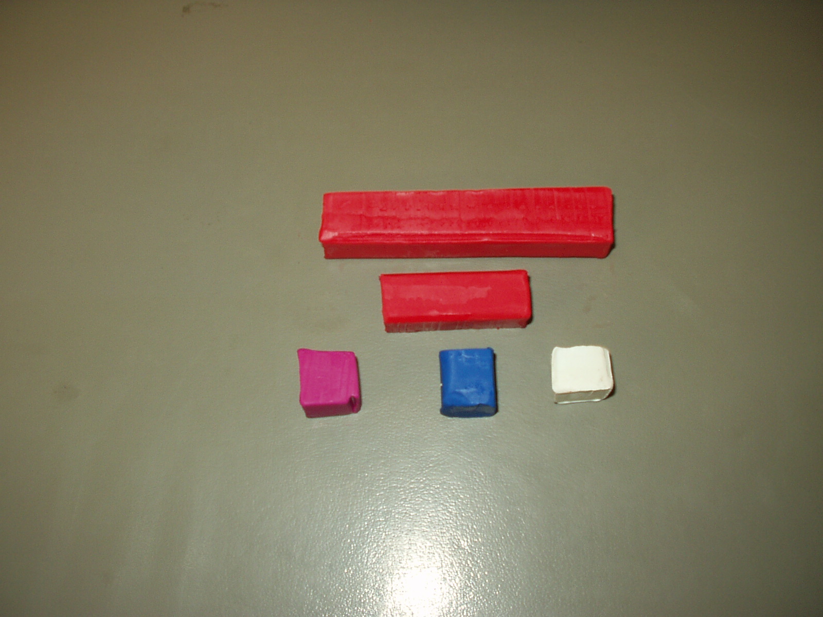 A set of four colors (white, magenta, red, and blue), cut and packaged, ready to hand to a student. This set of clay will be enough clay for one student to go completely through the Heart Constructions and Bypass Graft's Hands-On Body System Activity.
